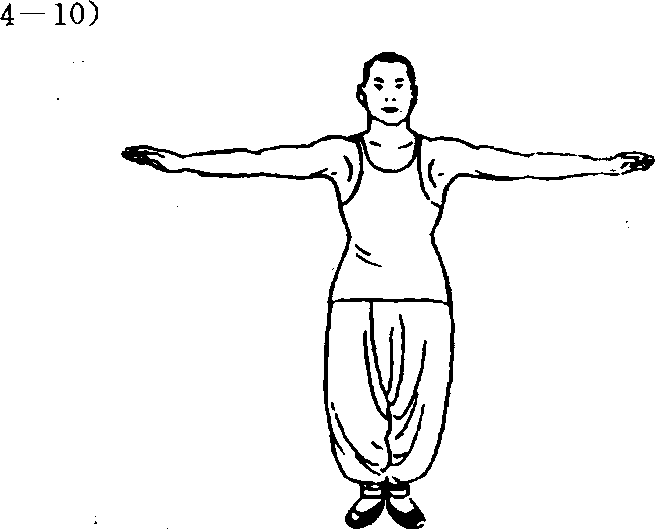 接上式,两手同时左右平行向上分开,与肩齐平,掌心向 下,手指伸直。眼向前平视。(图4 — 2)