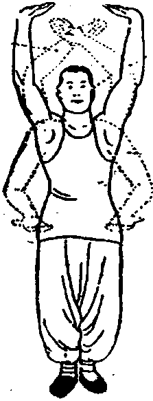 3 .两拳同时再上升至头顶,虎 口向上。目视前方。(图4-11 ±部 虚线部分)