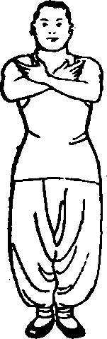 接上式,上体抬起立直,两掌内旋上举,至胸前交叉,成斜 十字形,掌心向内,右手在外,左手在内,含胸拔背;两膝略屈,