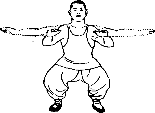 接上式,两手同时向前、向上伸出,与胸齐平,掌心向上, 手指前伸;同时两膝徐徐微屈,上体渐渐向下略蹲。目视前方。 (图 4 — 6)