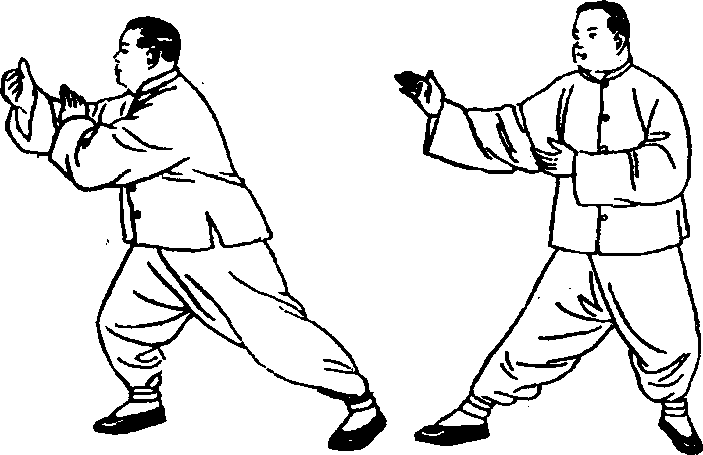 【要领】左肘与左膝须上下垂直于一条线上,不偏不斜。做 到沉肩垂肘,顶悬身正,尾闾收住。此势两动完整连贯,一气呵 成,中间不可有间断。