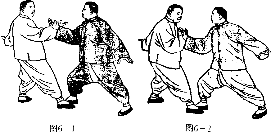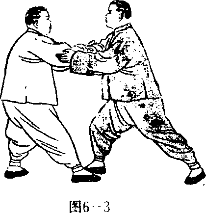 2. 甲双手向乙胸前按出, 两腿成弓步式;乙右臂向左侧 后化,坐腰、松胯、坐腿成圆 形,左腿实右腿虚,重心寄于 左腿,用腰腿化甲。(图6 — 3)
