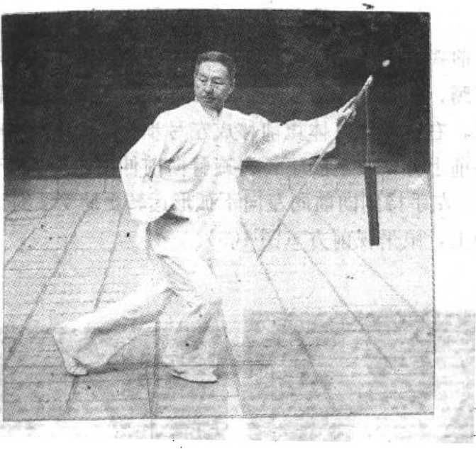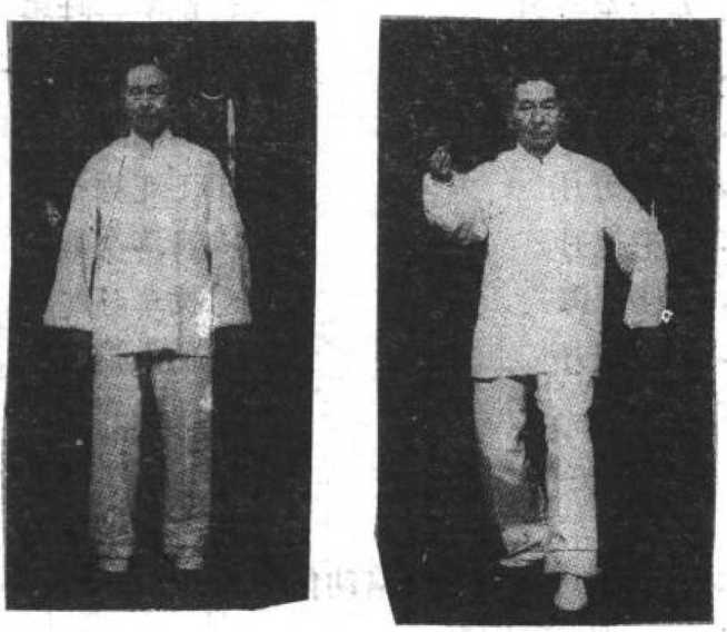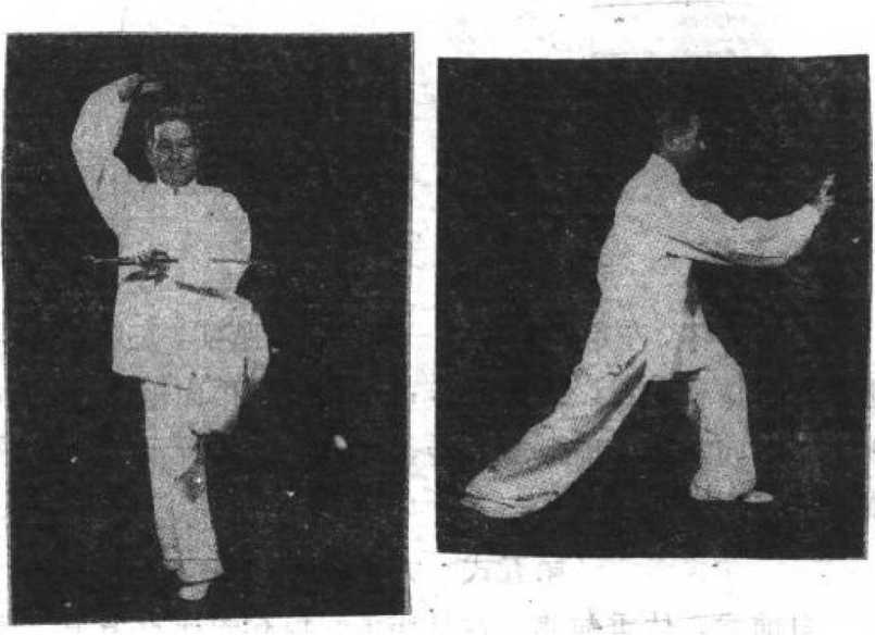 前势不停,体重移于左腿,提起右足,向前迈出半步,足