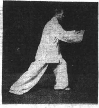 自前式,体重前移,右足变虚,提起向前跟半步,足掌. 落地后,足跟内扣约45度踏实,体重移于右腿,并向右转身, 右手接剑,左手握成剑诀并抚于右腕,将剑身向右后侧带至