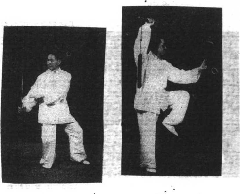 图107图108图109前势不停,右腿伸展站起, 左腿屈膝提起,大腿提平,开 胯;右手持剑向上,高举过头, 屈腕,将剑向左横向平刺于头 前上方,左臂向左伸出,剑诀 向上,掌心向右前方,眼平视