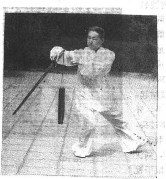 右胯旁,右臂外旋,将剑挑起, 剑尖向上,成垂直立于胸右侧 前方,左手剑诀抚于右腕上右; 小臂内侧,左足收至右足旁约 10厘米处,足尖点地,成丁字 步,眼平视剑尖(图108)。-