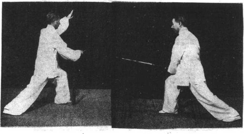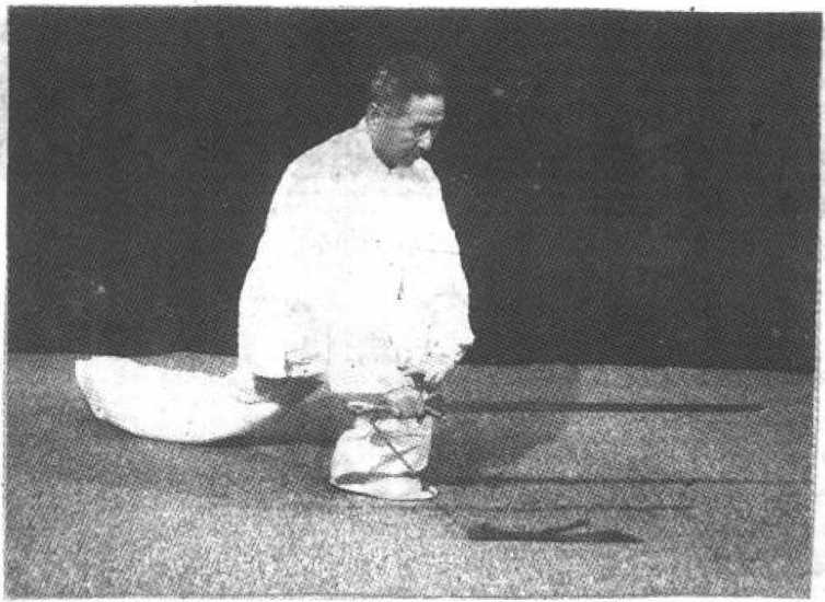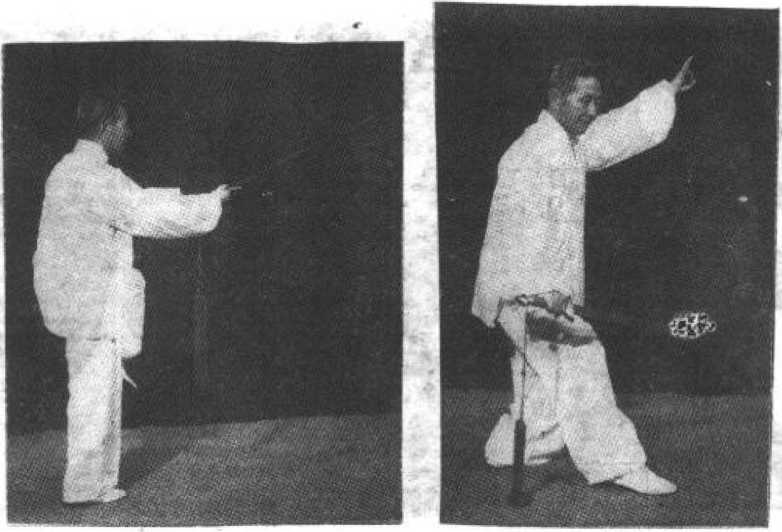 自前式,提起右足向右后方落步,踏实,体重移于右腿」 左足收回至右足旁后,再向左前力迈出一步,左腿屈膝,右 腿伸展,体重前移,成左弓步,右手持剑,向右后提起,右