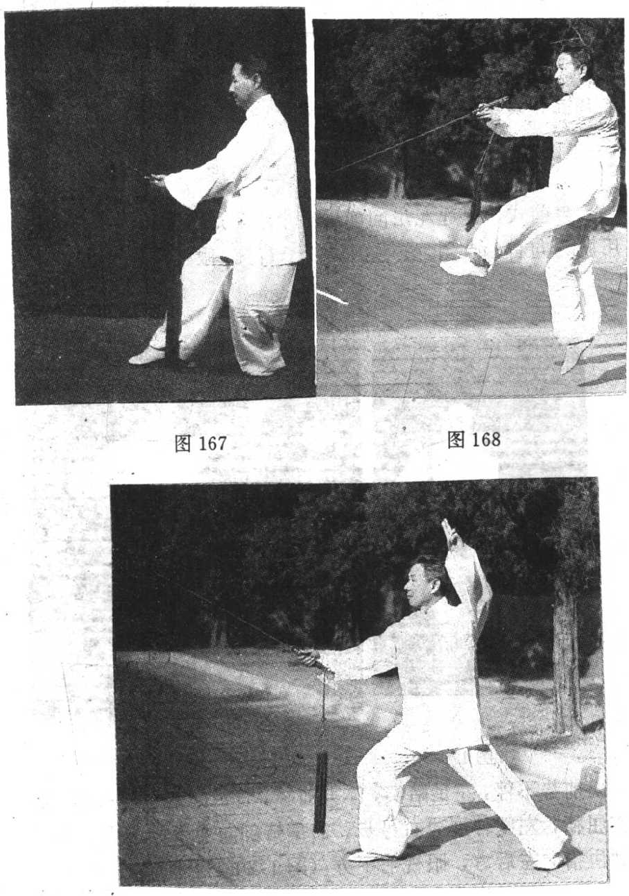 自前式,提起左足向前迈出半步,足跟落地。右手持剑 用腕力向右后点剑。左手剑诀抚于右腕,眼视剑身(图171)。