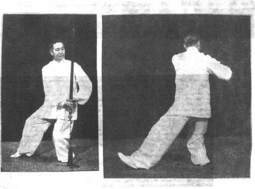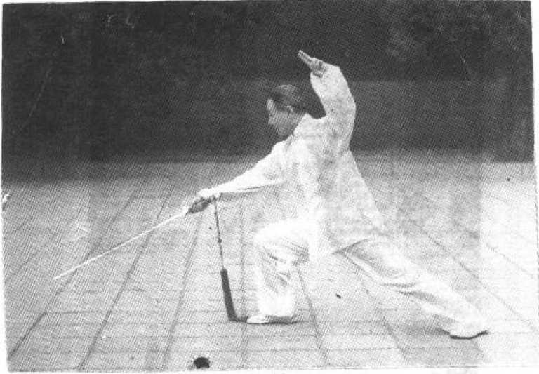 ?前势不停,左足踏实,体重前移,右足向前迈出一步,踏 实屈膝,左腿伸展成右弓步,右手持剑向前下方刺出。左手 剑诀指向左后方,眼视前下方(图172)。