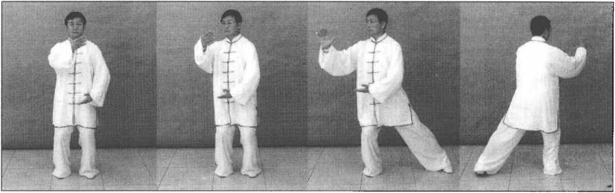 接上势,身体向左转,左脚全脚掌踏实,重心移于左腿。随体转,左掌向上经面前 向左前侧划弧,逐渐翻转掌心向外,掌指向,腕与肩平;右掌向下划弧至左肋前,掌心 逐渐转动向上,掌指向左,同时右脚提起向左移靠,前脚掌踏地;眼视左手方向。(图 5—410、图5—411、图5—412、图5—412背面)