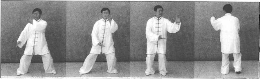 接上势,身体向左转,左脚全脚掌踏实,重心移于左腿。随体转,左掌向上经面前, 向左前侧划弧,逐渐翻转掌心向外,掌指向,腕与肩平;右掌向下划弧至左肋前,掌心 逐渐转动向上,掌指向左,同时右脚提起向左移靠,前脚掌踏地;眼视左手方向。(图 5-416、图5—417、图5—418、图5-418背面)