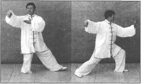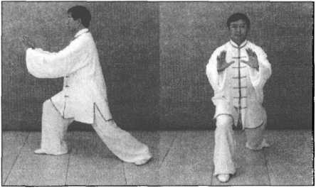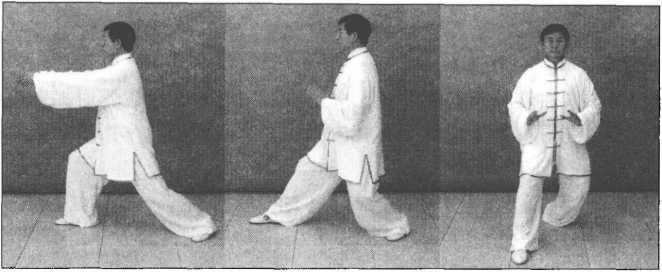 重心前移,右腿屈膝慢慢向前弓出,成右弓步;同时双掌向前挤出,腕与肩平,右掌 心向内,掌指向左,左掌心向外,掌指斜向上;眼向前平视。(图5—576、图576正面)