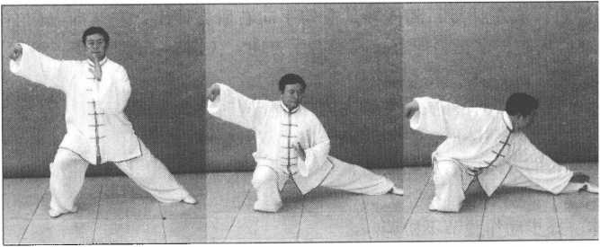 腰髓的转动使得身体右转不仅与右脚的外展要同时进行,同时带动双掌动作协调进 行。转体与右脚外展的方向为右后45度,即身体与右脚同时转动135度,左脚内扣90度, 左腿伸直,成左扑步。此时要松腰沉髓,肩髓相对,上下相随。右勾手随体转向右侧前 方伸展,意贯勾背,为“走劲”。即不丢不顶。感觉有重意时,即松肩而沉之化解。意 贯左掌,为“化劲”。要体会拳谚所云:“偏重则随,双重则滞。犹一羽不能加,一蝇 不能落。”由听而懂,由懂而走,由走而化之感。