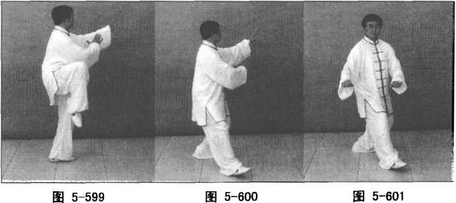 身体向右转,重心于左腿,左支撑腿屈蹲,右脚向右侧前方迈步,脚跟先着地,同 时随体转双掌下落,掌心向外,掌指向上;眼视左掌方向。(图5—600)