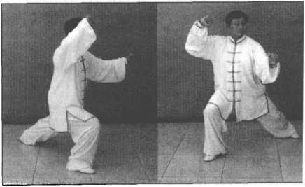 此动作特别要注意右腿的弓步方向为右侧前方,即右前45度,而双拳的打出方向 则为左前45度,是两个不同的隅向。双拳要向右做挂拳,力达双拳。然后双拳随腰懿的 左转,折肘向左前侧击打。定势时要立身中正,松腰沉髅,沉肩坠肘,双臂撑圆,肩背 舒展,气沉丹田。如拳谚所云:“拳之运动,惟柔与刚;彼以刚来,我以柔往;彼以柔 来,全在称量;刚中寓柔,与人不件;柔中寓刚,人所难防。”