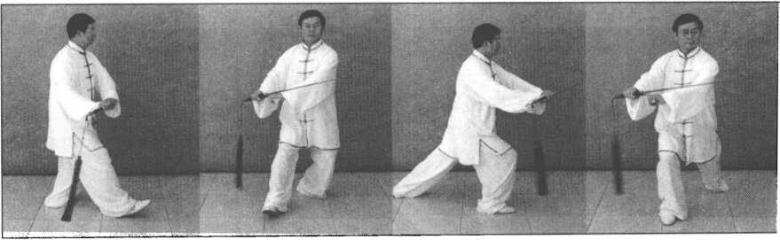 地,踏实,成右弓步。在动作过程中左脚始终是紧扣地面,不可任意转动。随着身体重 心的前移,右手剑同时向前引剑,剑尖略高,仍控制在身体中线附近。向前伸引剑时, 双臂不可伸直。要达到立身中正,松肩垂肘、双臂撑圆,体现出传统杨式太极拳端庄的 气势。