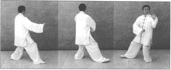 接上势,身体向左转,左脚尖外转45度,重心于左腿,右脚提起向前迈出,脚跟 先着地;随身体转动左臂外旋,左掌转动掌心向上、向左后而上划弧至左肩外,掌心向 外,掌指向上,腕与肩平;右臂内旋,右拳向左下划弧至腹前,拳心向下,拳眼向内; 眼视左掌方向。(图5 — 255、图5—256、图5—256正面)