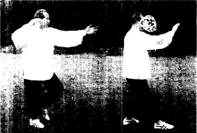 (图24-1 ).右足提起向西南方向略进半步成为扣步,足尖 向东南踏实后,全身顺势向西南角靠去(图24-2)?眼神转 向东,两手分开(图24-3),同时胸脯由东南逐步转向东,