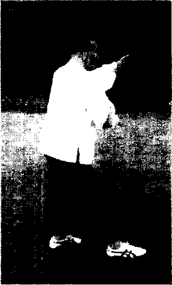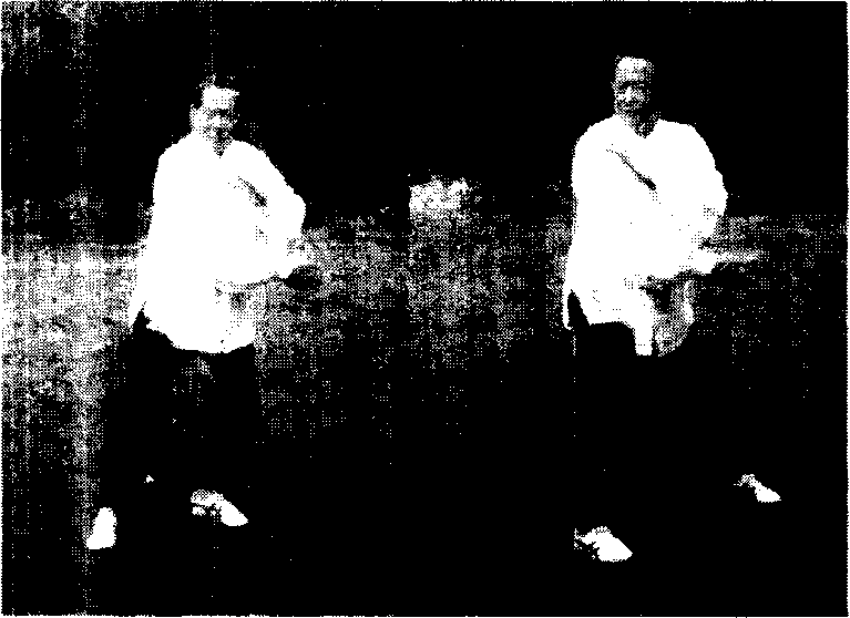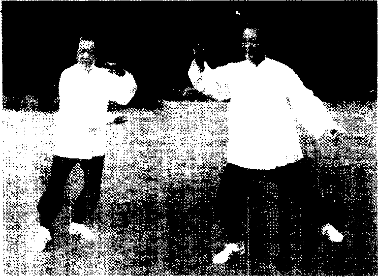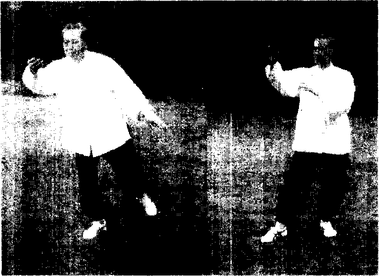 体弱及年老者,右脚后退至西南方向,先以大脚趾落 地,继之脚掌、脚跟着地,然后再将身体转向西南(内 弦),转动时左脚以脚跟为轴,转向正南,右脚尖转向西南。