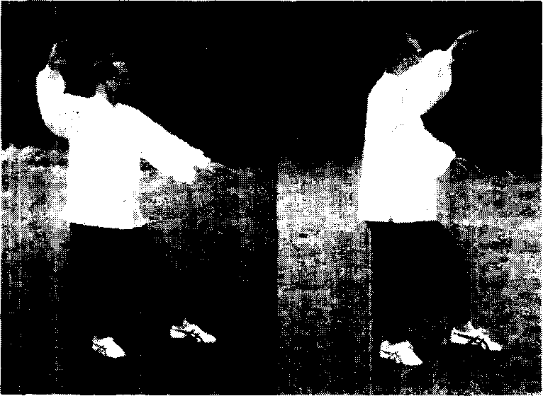 意在上接青天,左足稍收回使足尖向东轻点地面。此时,右 手指指天,手心向东,意在上接青天,左手心向下,手指 向东,意在下按木桩,全身“坐”在右脚上,着力重点在 右足跟(图24-4)。