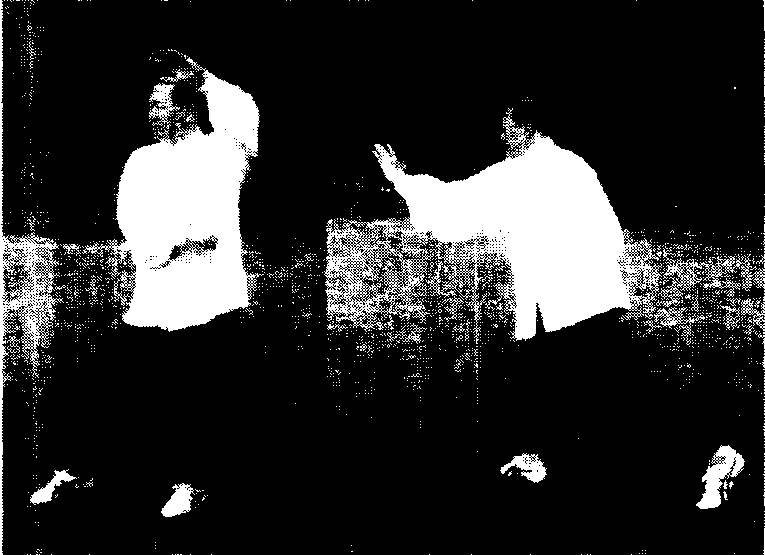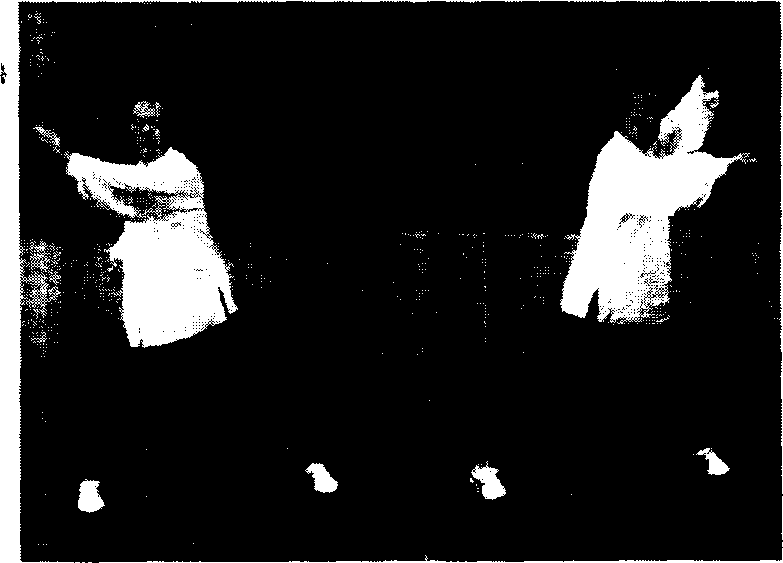接(图29-3)左脚尖撇向西南,上身稍左转,两手成 左合手(图30-1),右脚上一步双手随向前成为双手瑚式 (图30-2),然后依次为捋式,挤式,按式,均与第3式相 同。