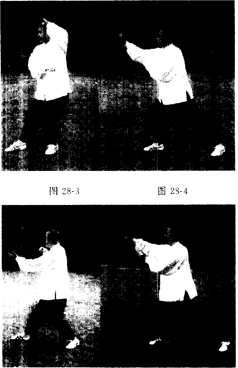 仆步(图28-2) o左脚尖转向西南,腰胯左移右转右脚掌随 脚跟后退到近左脚旁(图28-3)o