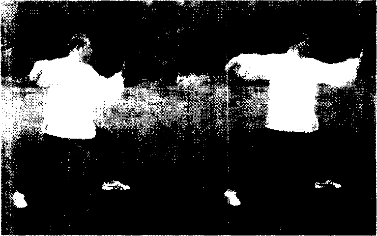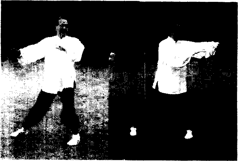 双手旋转如车轮状,是以腰胯带动两手左右反向似圆 轮转动。腰部转动的幅度可按照各人的身体素质的不同而 变的。体质好的人,左手或右手转至与肩相平时,转腰的 幅度可以大,手转到正北方,以加强腰胯运动量。架子愈 低,运动量愈大。如果腰腿力量不够,则可以稍许高一些 为佳。