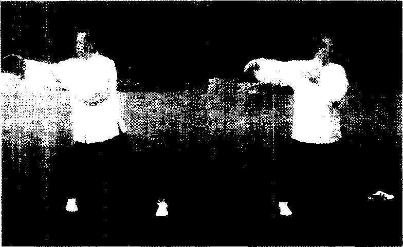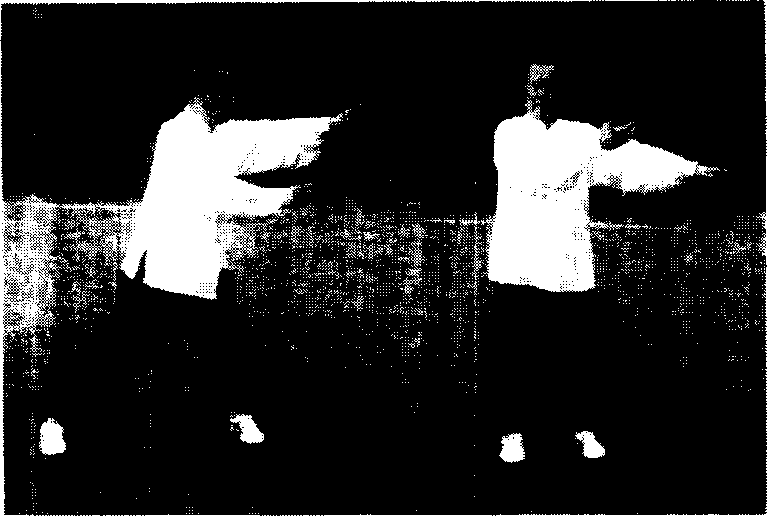 单鞭定式一定要练得正确无误,才能进行下一式。否 则,这一动作练得不正确,会产生连锁反应,影响到练习 的效果。