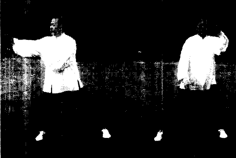 欲左靠,眼神领先左顾;欲右靠,眼神领先右盼。眼 神领先向东时,左手才向东按出,势势做到眼神领先,才 能意到气到。