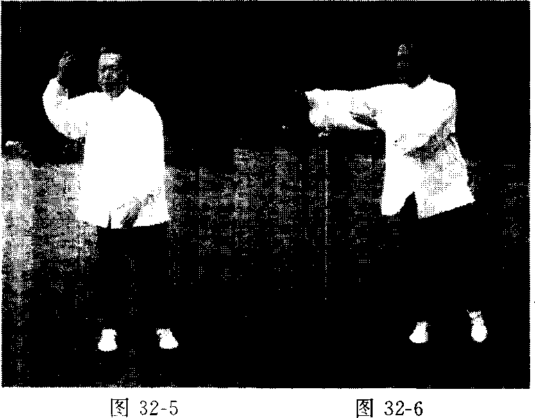 势。左手心向内屈肘在胸前(图31-4),随着腰胯向左转动, 把左手掌心逐渐转向东,同时右足尖勾转向东南(图31- 5),右腿伸,左膝弓,当左膝弓到垂直于脚趾时,左手也 趁势向东按出,同时右手继续向西平转,使两手臂近乎成