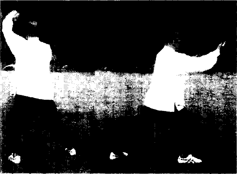 接搂膝拗步的方法与第 7式、第10式相同,但方向 相反,前者朝东,此处朝西, 所以这里的说明较简略。