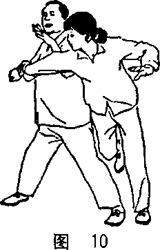 :我双手轻管对方单臂,引近胸前,对方乘 势用肘挤击我胸。我两肘沉下,两手突然用抖劲向内收,使其 单臂挺直向我身,同时,我胸部突然挺向外,猛抖其肘关节。 对方肘关节必受创痛。这叫做“手合胸开”,也叫做“外合内 开"。(图 8、9)