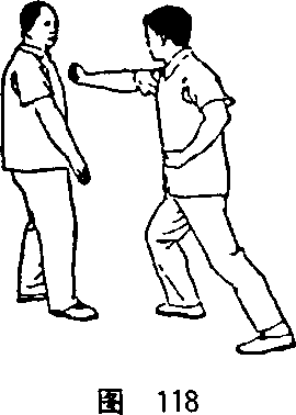 1. 我正对敌人,彼以右顺步拳来击我,我双手自下而上划 弧沾粘彼右臂,腰右转,迅上左足套住彼右前足,我双掌向右 下方急握彼右小臂,使彼前倾欲跌,我左小臂尺骨处则沾粘彼 右上膊控制其肘击肩靠的活动(图118、119)。