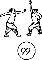3. 如彼当我套其右前足时即退右前足于后方,我双手粘 随,腰左转,进右足套其左前足,腰右转,双掌划弧以尺骨处向 右横侧打击其乳部、胃部(图121)。