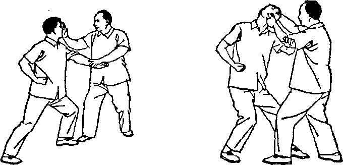 双手沾粘缠绕,向右(左)下急振时,要使对方前倾欲跌, 向左(右)横打时,要如刀砍斧削,使彼痛入骨内,又被腾空 掷跌。