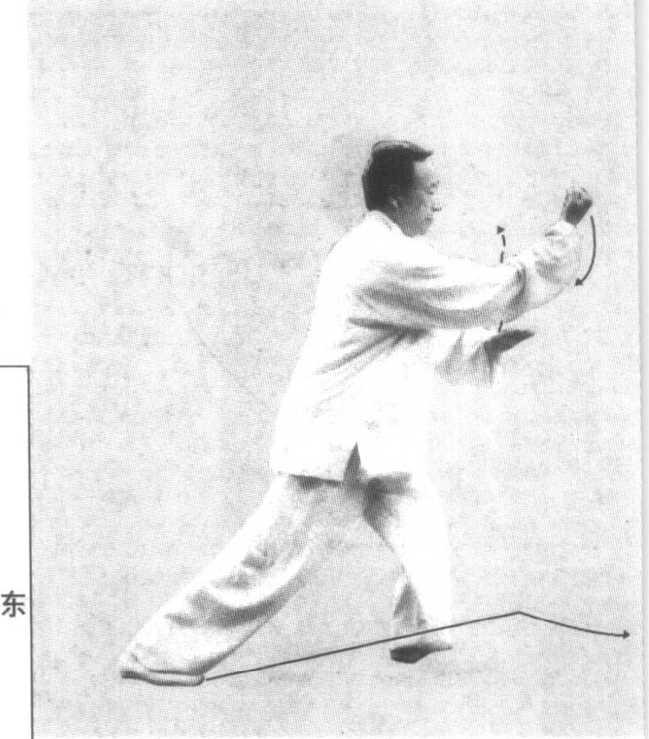 重心前移、上体伸探与左掌下落、右拳向前外搬出应协调一 致,柔和到位。右掌向前搬打时,左脚重心要稳,身体要斜中有 正、舒展自然,不可僵劲。