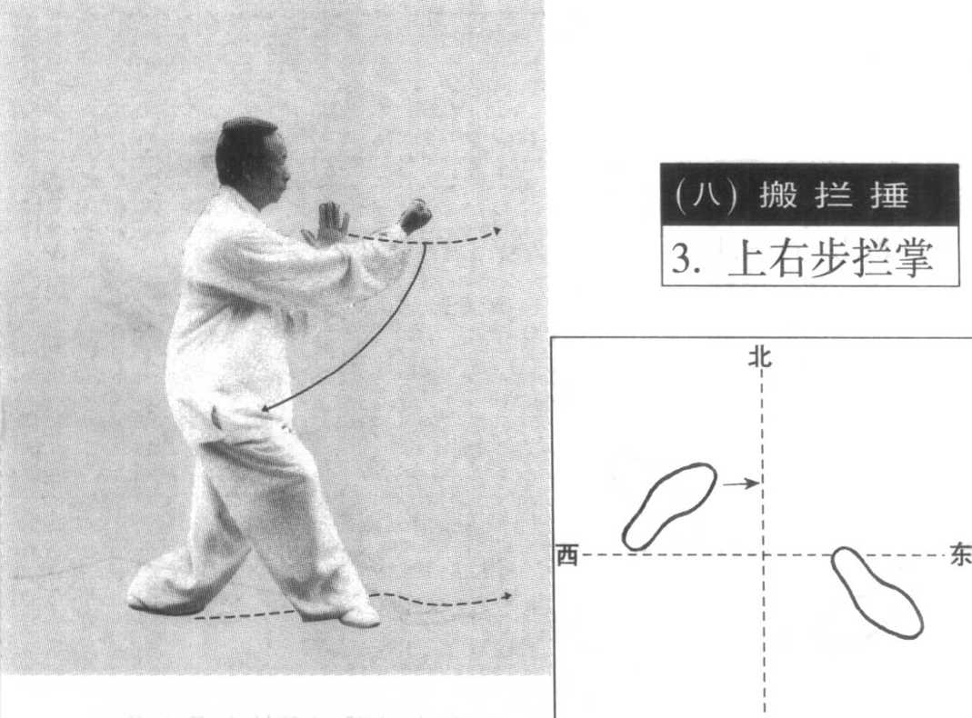 上右步拦掌为吸气。