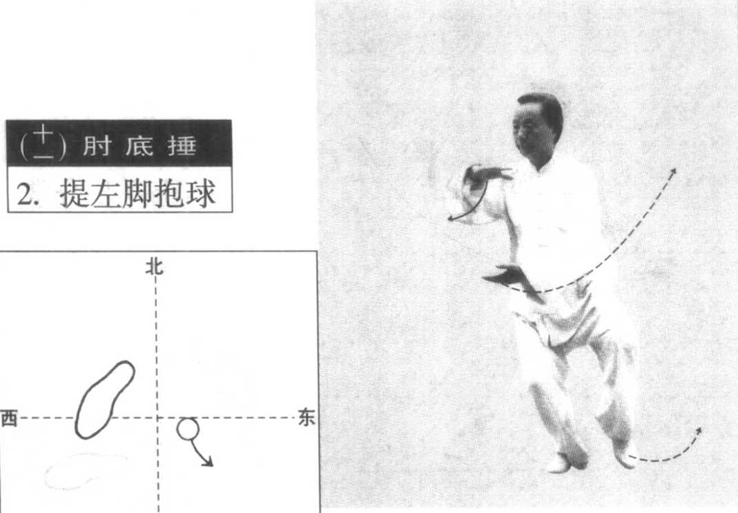 微右转体、重心移至右腿、提左脚与两掌旋转划弧抱球应 协调一致,同步到位。提脚时,右脚立稳,右膝屈蹲,同时坐胯; 左脚不要提得过高,身体中正,腋下含空。