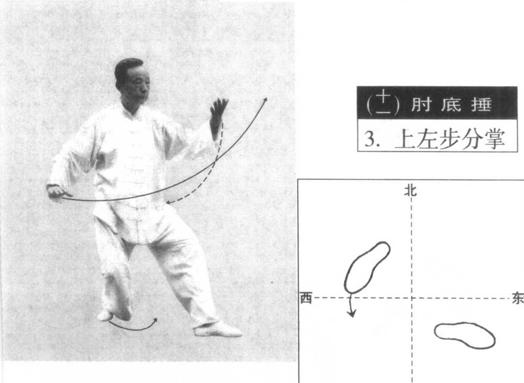 重心立稳于右腿,身体微左转、上左步与两掌划分应协调同 步。上左步时,右腿重心要立稳,不可向前移动身体,这样才能保 持上步轻灵、沉稳和周身舒松。