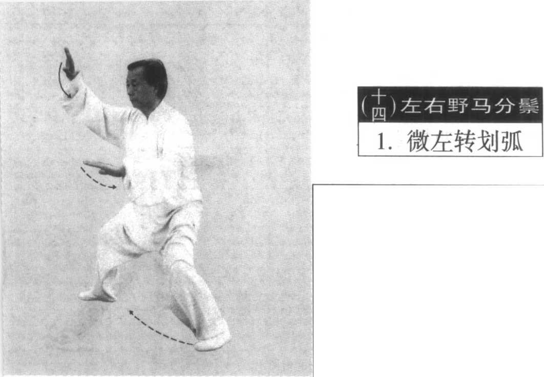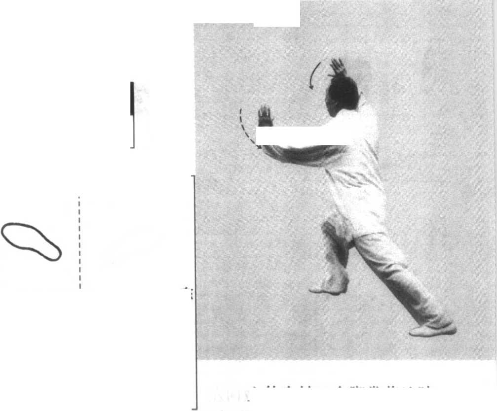 上体微左转、重心微向左移与两掌随身划弧应协调同步。转 体划弧时,左腿要屈膝坐胯,右腿要伸而有屈。两掌划弧要随身 而动。不可低头弯腰。