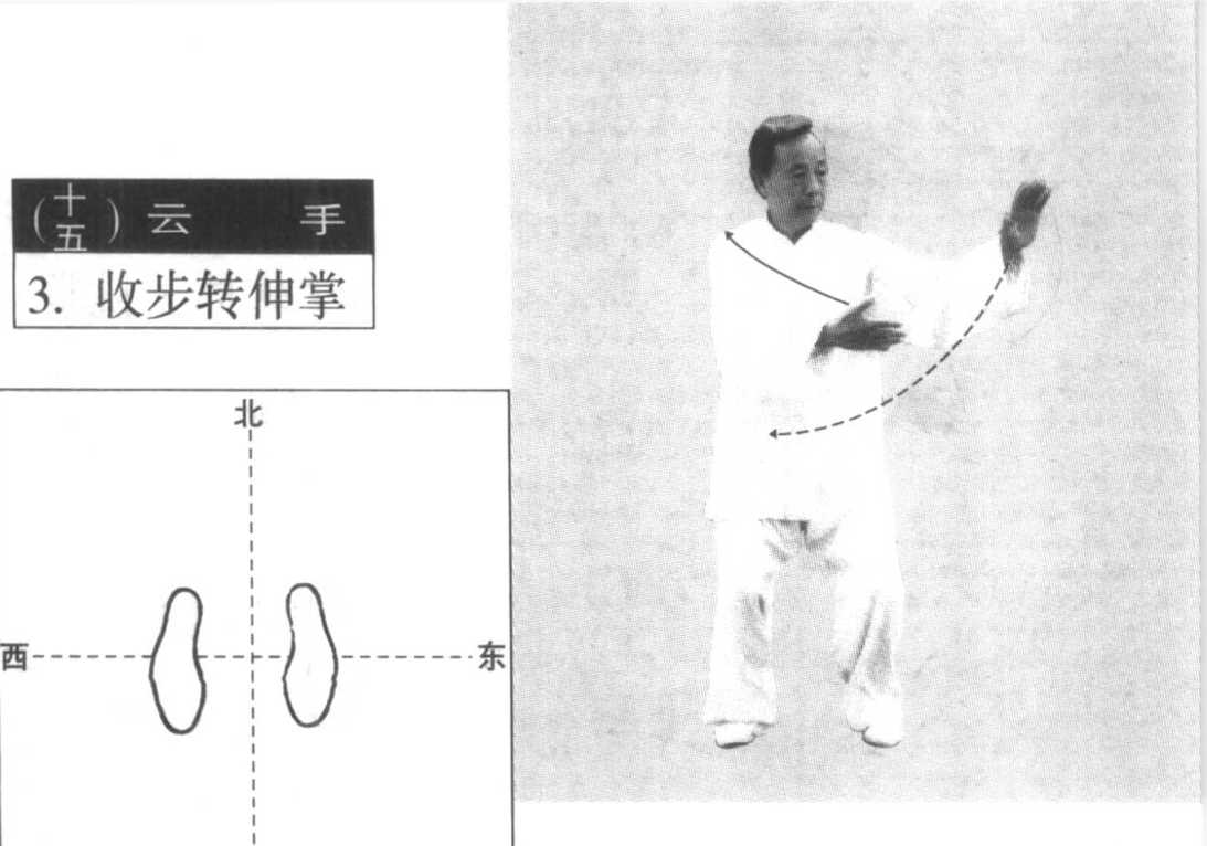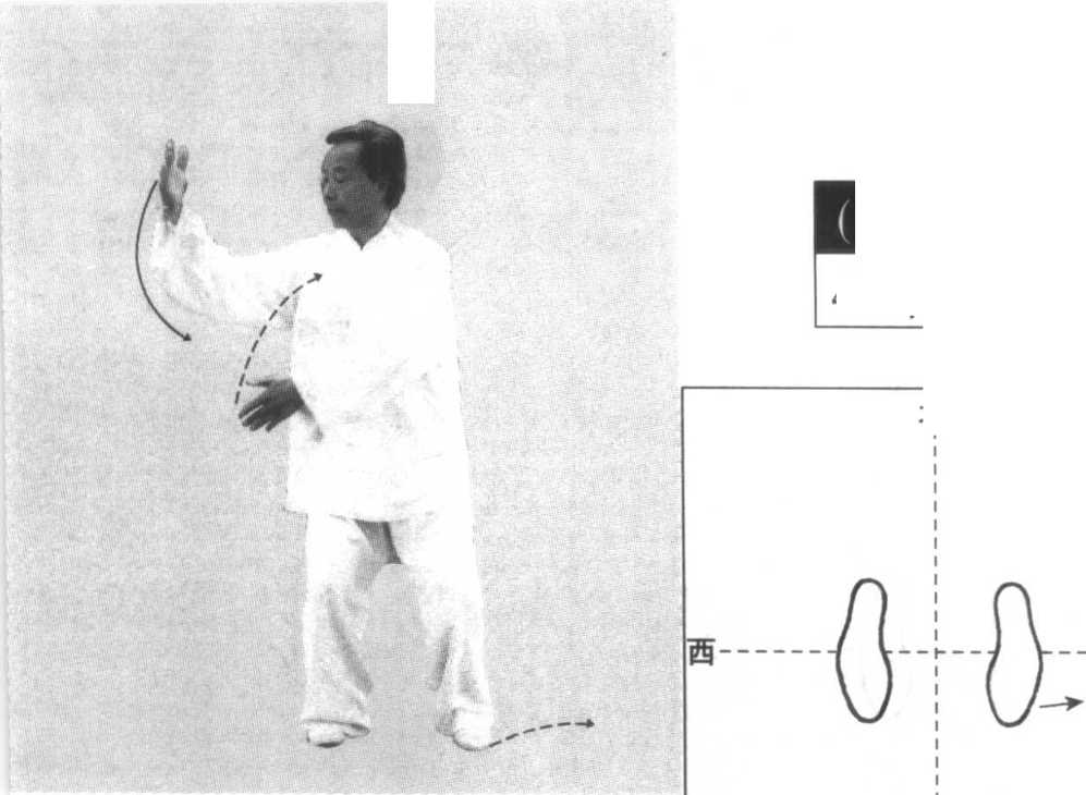左脚内侧落地,两脚平行向前, 相距20厘米左右。右掌经下腹前划弧至左肋前,掌心斜向里,指 尖向左;左掌内旋翻转至左侧方,腕与肩同高,掌心向外,指尖斜 向上。目视左前方。