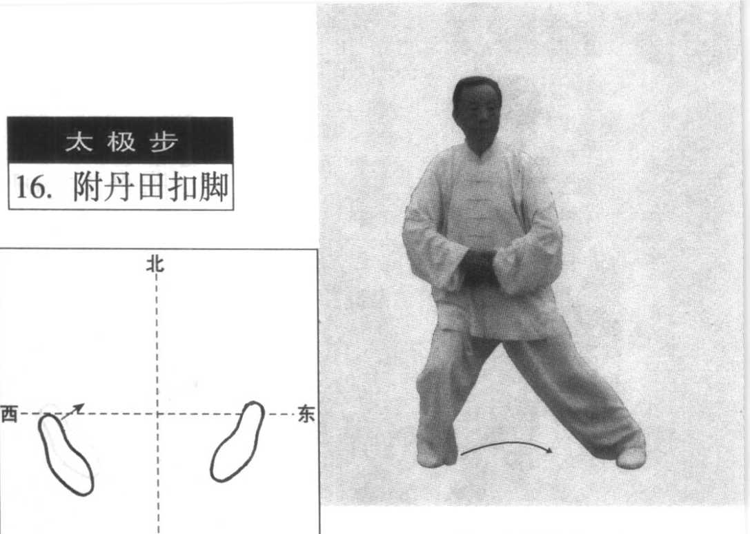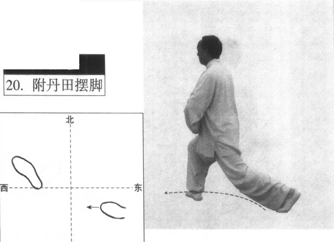 微右转体、摆脚前移、左脚跟离地与两掌附于丹田要协调自 然。摆脚时,右腿仍屈膝坐胯;左腿微屈膝沉胯,脚前掌撑地。具 体要求参看前述太极拳五大要领。