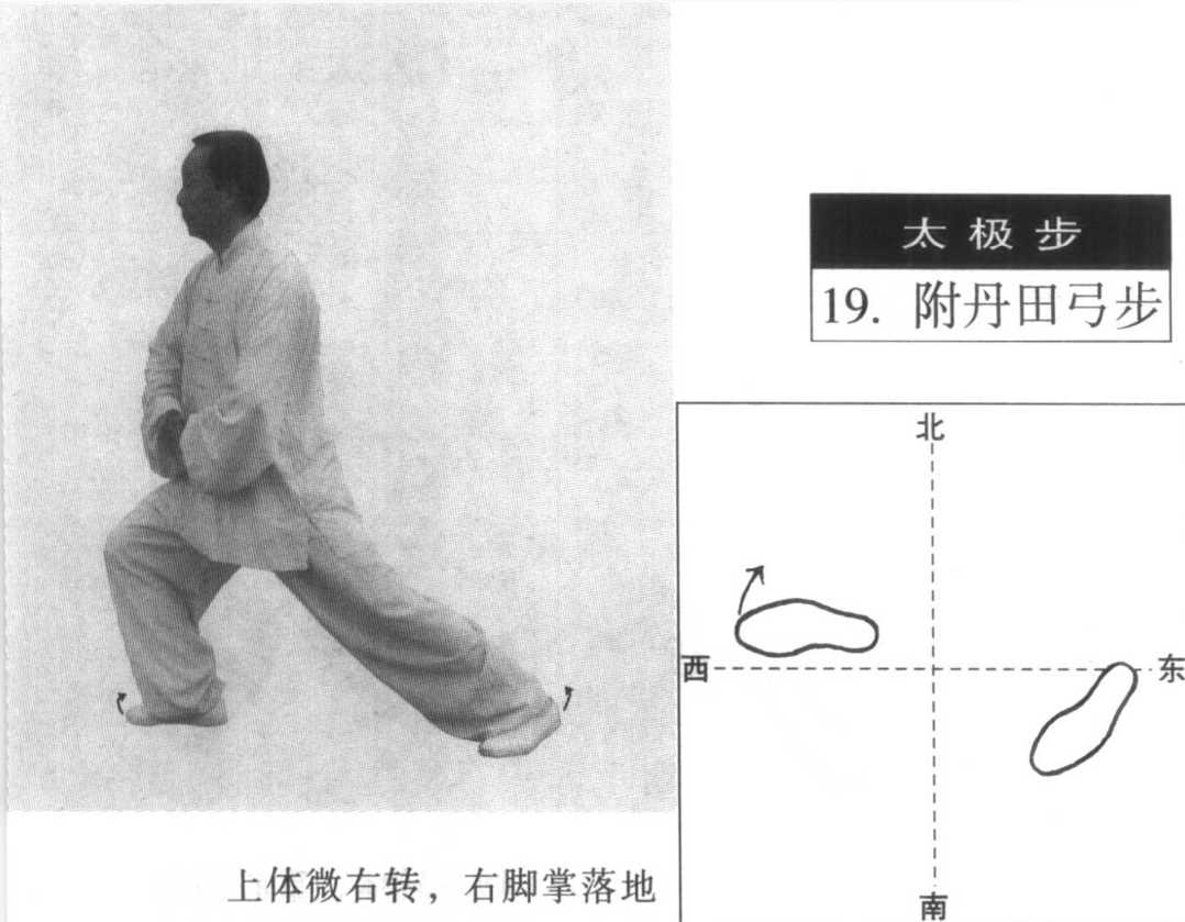 微右转体、重心前移成弓步与两掌附于丹田要协调自然。 弓步时,右腿屈膝坐胯,膝盖不得超过脚尖;左腿伸直、微屈膝, 沉胯。具体要求参看前述太极拳五大要领。