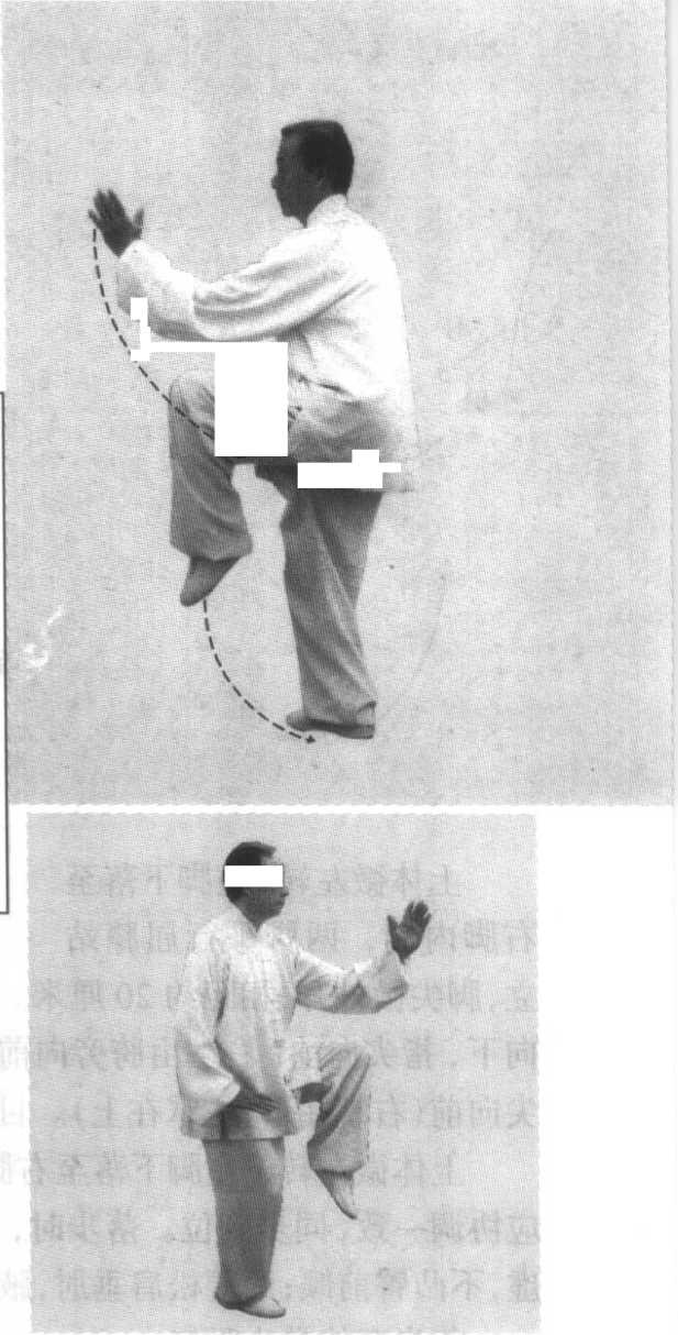 上体微左转、重心移至左腿、提右膝与右掌伸、左掌下落应 协调一致,同步到位。独立时,左腿微屈膝立稳,右膝提起高过 胯,右肘与右膝上下要相对。身体中正,舒松自然。