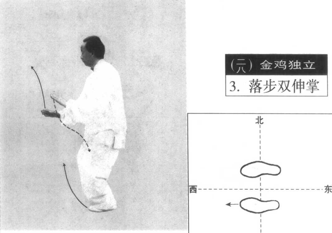 至左腿;右膝随之提起,脚尖 自然下垂。右掌向右上伸举,腕同肩高,掌心向左前,指尖斜向 上;左掌同时下落至左胯旁,掌心向下,指尖向前。目视右掌 前方。