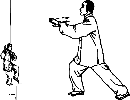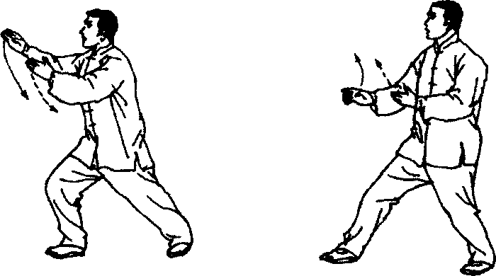 ③ 捆臂、松腰沉腕和弓腿三者必须协调一致。首先要松 腰,使气沉丹田,下盘稳固,通过两腰侧抽托,产生腰动。