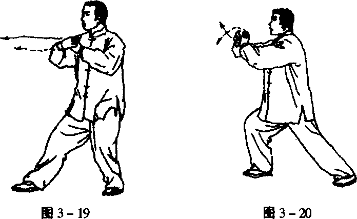 6. 身体微右转,右掌臂屈举于胸前,掌心向里;右掌扶 于右前臂内侧,掌心向外;同时重心前移,右腿屈膝前弓,左 腿伸直成右弓步;随即以右前臂外侧为力点,向前徐徐挤出; 左掌扶于右前臂内侧,高与胸平;眼看前方(图3 - 19、3 - 20) o
