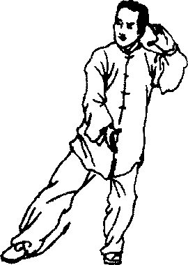 3. 重心后移于右腿,左脚跟着地,成左虚步;同时左掌 从右臂里侧向前穿举,掌心向右,掌指向上,高与鼻平;右掌