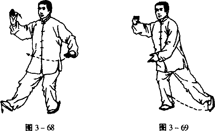 1. 身体左转,重心左移,右脚内扣踏实,随即身体微右 转,重心移于右腿,左脚跟提起;同时右掌弧形向左移至右胸 前,掌心向下;左掌翻转移至右腹前,掌心向上,两掌心上下 相对,臂成半圆形;眼看右前方(图3-68. 3-69)。