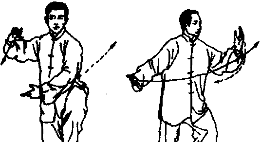 ② 右手向右前方例出时,要由腰而肩、而肘、而手,节节 贯穿地洌出。